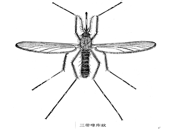 2、淡色庫蚊:喙、翅暗色,跗節無白環,中胸腹側板上部和下部后緣有兩群淡鱗簇;腹節背板II-VII淡色基白帶后端平齊;雄性尾器陽莖側板背中葉末端平齊或圓鈍。